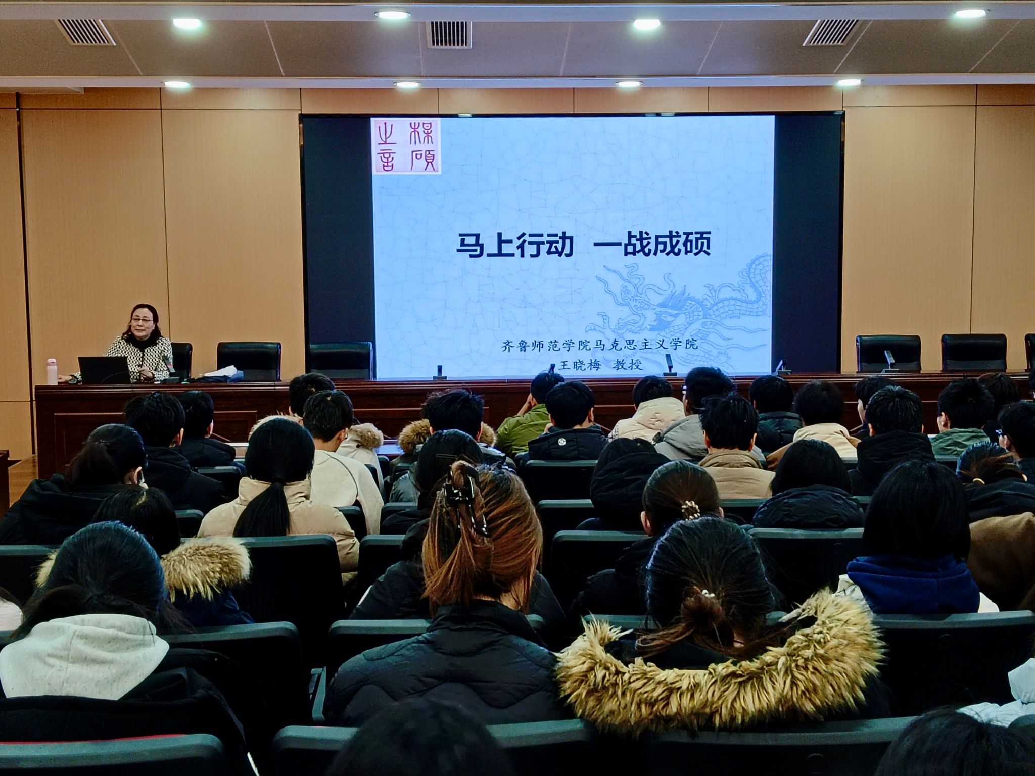 为帮助学生精准把握考研形势,明确备考方向,2026年1月16日,马克思主义学院学风建设指导教师王晓梅教授在齐鲁师范学院章丘校区第二学术报告厅举行2023级学生考研指导会。本次会议由马克思主义学院党委书记郭百灵主持,学院党委副书记毛雯、学生党支部书记王雅文和2023级全体学生参加。