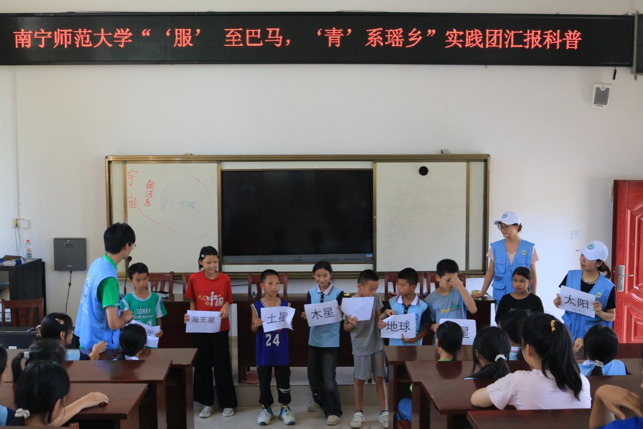 2024年7月8日,南宁师范大学地理科学与规划学院“‘服’至巴马,‘青’系瑶乡”社会实践团在巴马瑶族自治县燕洞镇中心小学成功举办了一场别开生面的天文科普宣讲活动,为乡村的孩子们搭建起了一座通往宇宙奥秘的桥梁。