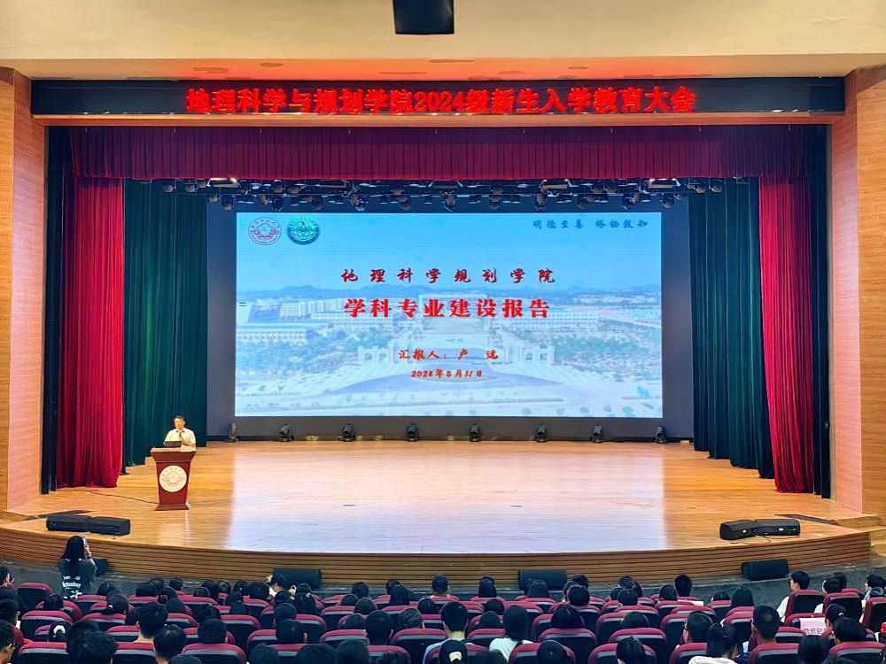 8月31日,地理科学与规划学院在武鸣校区1号报告厅举行2024级新生入学教育大会。学院党政领导班子成员、系主任、2024级本科班主任、学工办辅导员和600余名入学新生共同参加大会。大会由学院党委副书记李海琛主持