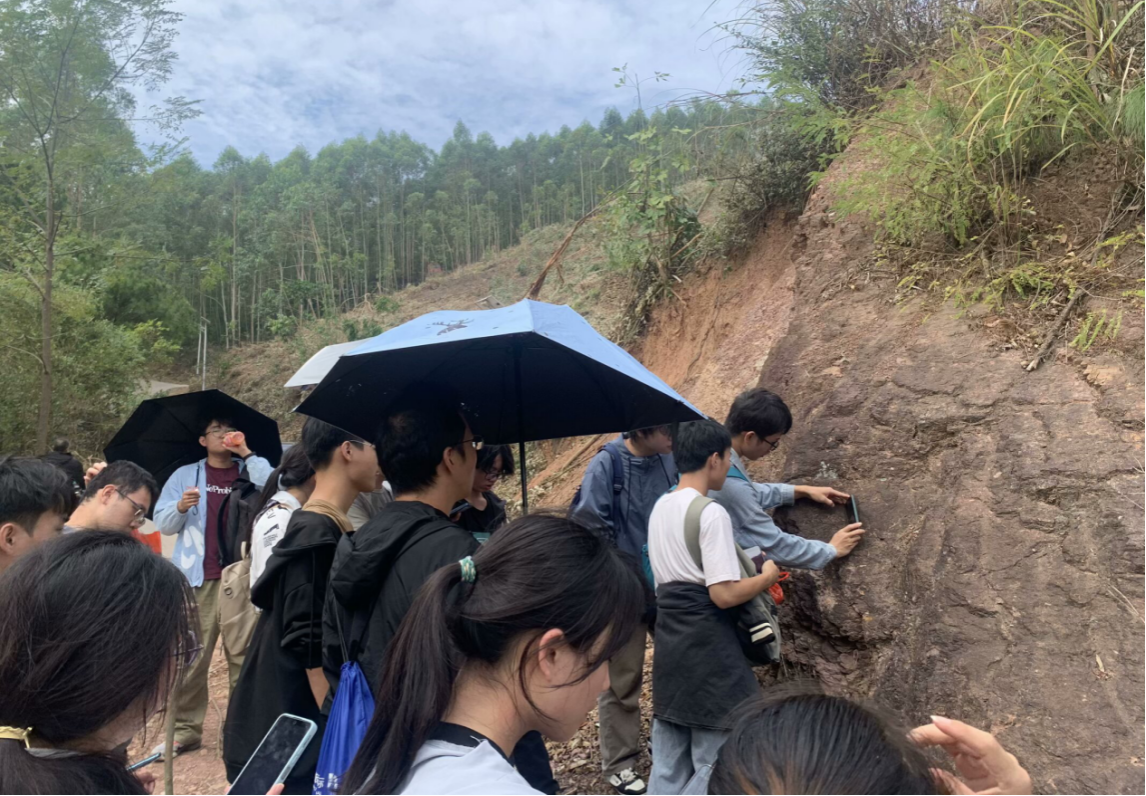 10月29日上午,实习队伍来到横县六景镇霞义山。该地发育有十分典型的泥盆纪标准剖面,是我国著名的华南泥盆系过渡型的地层标准剖面,剖面含深水相和浅水相两种沉积类型,是广西深水相和浅水相之间地层对比的桥梁。该剖面层序完整,地质特征清楚,古生物类型丰富多样。实习路段岩层由老到新分为寒武系、莲花山组、那高岭组、郁江组、莫丁组。同学们在徒步登山的过程中展开调查,通过当地泥盆纪化石的产状反演其沉积环境。由于其沉积连续,推测其沉积环境稳定;出露岩石岩性为页岩,化石以腕足类生物化石居多,因其生存需要大量阳光,推测为几十米的滨海到浅海海洋环境。同学们在思考的过程中逐渐起了建立四维时空思维,培养了动态的分析能力。随后同学们通过山脚与山顶岩层的产状与新老关系进行对比,开始思考六景地区泥盆系沉积环境变化代表的是海侵还是海退,并对霞义山的岩石产状进行了测量。
