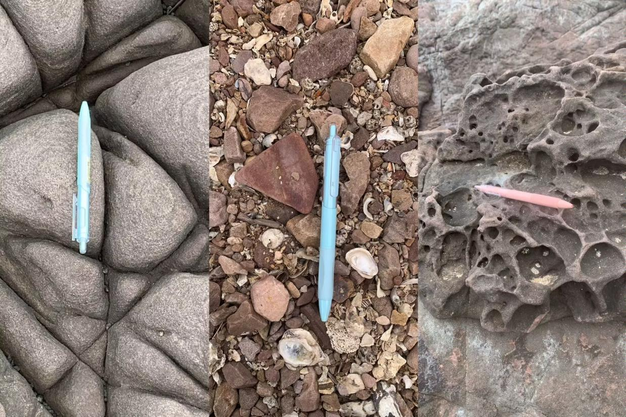 10月27日上午,实习队伍到达江山半岛怪石滩。怪石滩属于石质海岸地貌,岩石以侏罗纪的紫红色、暗红色和暗紫色砂砾岩为主。同学们对眼前形状各异的岩石感到惊奇,于是对怪石滩上地貌的类型以及成因进行考察。海蚀地貌形成原因是怪石滩岩层受到板块运动形成密集的节理,海水沿沉积岩的层面、节理面侵蚀。同学们在怪石滩上发现的海蚀地貌有海蚀崖和海蚀平台,海蚀崖是海蚀作用下岩石海岸后退所形成的岩石陡崖,海蚀平台则是在海蚀崖形成后,由于海水的侵蚀作用,海蚀崖会不断后退,最终在海蚀崖前形成一个平坦的台地。同学们通过观察岩石形态发现其侵蚀作用有海水冲蚀、磨蚀和盐风化等。最后,同学们利用手机测量了岩层产状,通过数据发现实习队伍正好处于背斜核部。