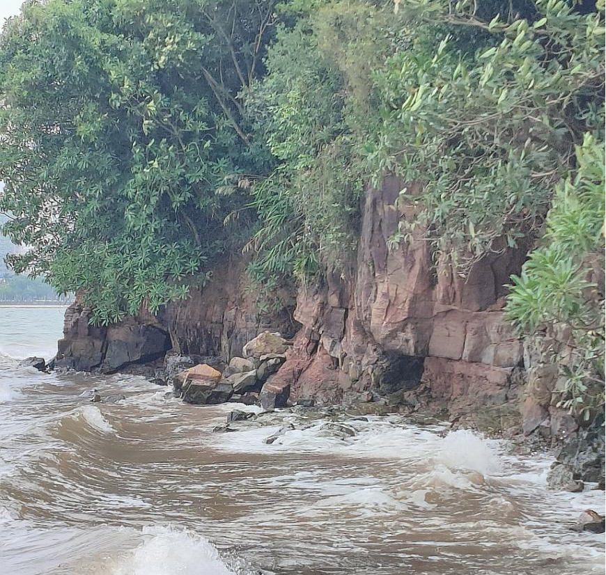 10月26日下午,实习队伍到达防城港龙马明珠广场。同学们观察了当地独特的海岸地貌,观察了典型的背斜构造。同学们联系该地独特的背斜构造、海岸呈垂直节理发育的岩石及防城河的河流侵蚀运动多种自然地理要素推导出该地港口区的地址演变过程:龙马明珠广场原为背斜,岩石垂直节理发育,受防城河下切侵蚀作用强烈,后受海水倒灌,形成了石质海岸地貌。在实地观察中同学们对防城港市港口为何建在西边而不是东边进行了探讨。同学们讨论后认识到防城港市西边为石质海岸地貌,水深且无需清淤,是建设港口的不二之选。联系广西众多港口发展的困境,同学们还了解到建设平陆运河对充分发挥广西众多深水良港资源的重要性及必要性,对人地关系有了具体的思考与认识。