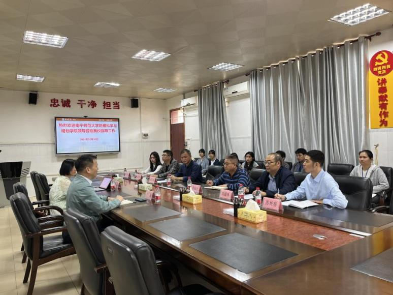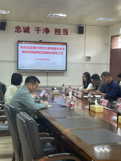 2024年10月30日,地理科学与规划学院院长卢远和地理科学系副主任韦晨前往钦州市第二中学与实习单位的副校长陆元谋、教务处主任袁盛林等校领导开展座谈,进行实习中期检查,了解13名学生在实习单位的整体表现。