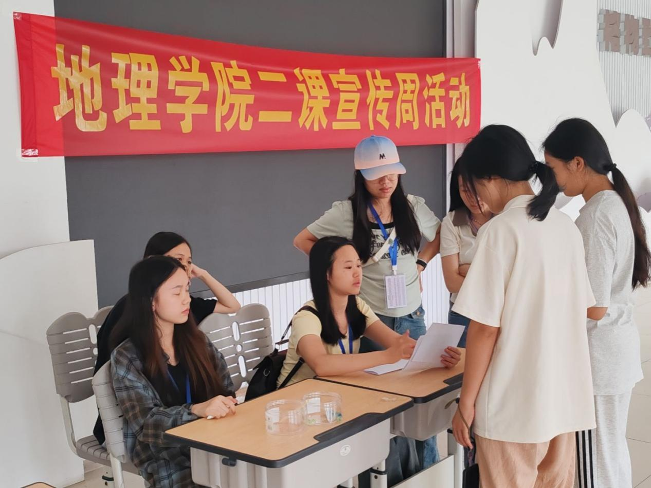 为加深全院在校学生对第二课堂相关知识的了解,5月24日,地理科学与规划学院二课小组在武鸣校区地源楼一楼开展2025年春季二课宣传周“二课知识默契大闯关”活动。