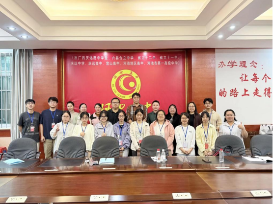 (各教师骨干、河池市地理教研员覃泽花与实习生合影留念)