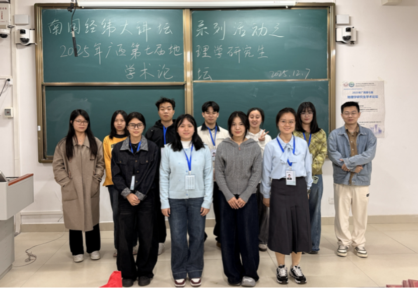 2025年12月7日,2025年度广西第七届地理学研究生学术论坛在南宁师范大学武鸣校区武一教学楼举办,特邀陈芸先、邓曙光、李俭、刘柄麟、宋立全、汪珍川、张胜前、钟仕全等多位地理学领域资深专家担任评委。