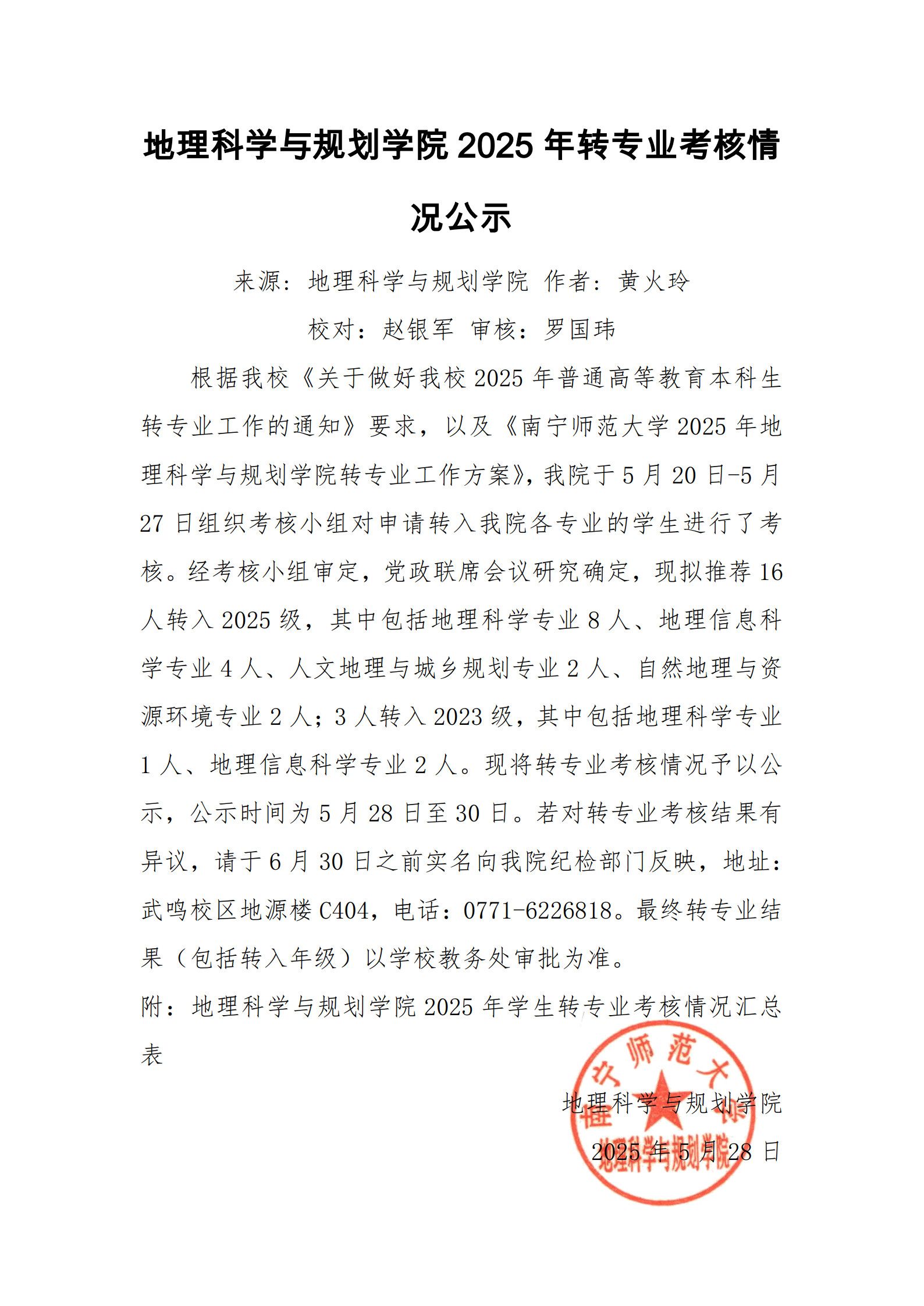 地理科学与规划学院2025年转专业考核情况公示