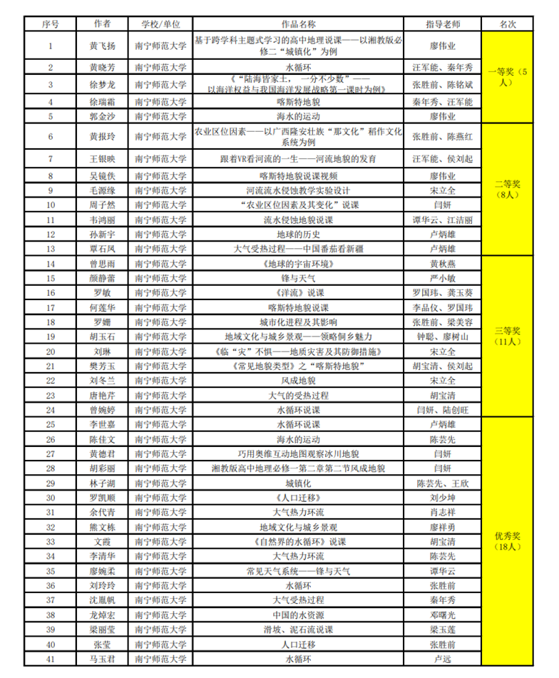 南宁师范大学地理科学与规划学院学科教学(地理)专业硕士研究生在此次说课大赛中表现优秀,于众多选手当中脱颖而出,共斩获硕士组一等奖5项、二等奖8项、三等奖11项以及优秀奖18项。这些荣誉,都是每一位参赛选手不断努力、不断探索、不断突破自我的结果。具体获奖情况如下: