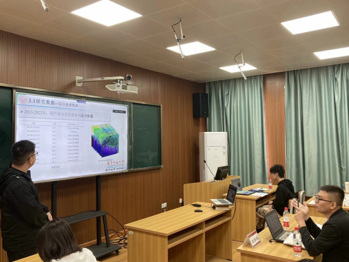 复赛会场上,选手们的精彩汇报不仅展示了他们近期的学术成果,更是给台下的观众带来了一场“学术盛宴”。来自南宁师范大学2022级人文地理学的王秋礼同学,她以桂林市文市镇为典型案例介绍了工矿型城镇在国土空间方面如何进行修复以及未来可持续发展方向,展示了人文地理学在可持续发展中的重要作用。南宁师范大学2023级地图学与地理信息系统的黄雨欣同学介绍了如何利用时序InSAR技术通过遥感图像对尾矿库进行形变监测,展示了地理信息系统专业未来可以依托雷达遥感对地表形变进行监测,对于一些自然灾害做好预防工作。来自广西师范大学的学科教学(地理)肖丽梅同学,她以人教版必修二“走向人地协调——可持续发展”知识点为例子,阐述了“三生空间”理论在高中地理教学中的渗透,体现出“可持续发展”观念已经与中学的教育深深的融合起来了。除了参赛选手的精彩汇报,评审专家的点评也让在座的同学受益匪浅。汪军能副教授从选题角度进行点评,指出研究要以问题为导向,从问题出发,研究如何解决现实问题,指出选手研究的论文要有启迪性,后续研究要注重与实践结合,将研究应用于真正的教学;其他评委老师也从论文写作格式以及文字表达等方面对参赛选手进行点评。
