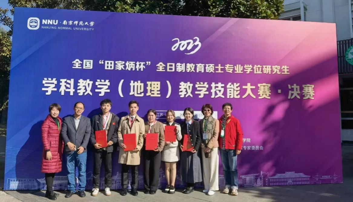 11月17到19日,第二届“田家炳杯”全日制教育硕士专业学位研究生学科教学(地理)教学技能大赛在南京师范大学举行,这是疫情放开后恢复的首场线下形式的全国教育硕士教学技能大赛。我校2022级学科教学(地理)专业参赛的五位同学由张胜前老师、廖伟业老师、陈芸先老师、梁浩原老师带队参加本次大赛,均取得优异成绩,其中赖兴昱、李敏琦、熊雨秋、吕灿同学获三等奖,王泓力同学获得优秀教学设计奖。