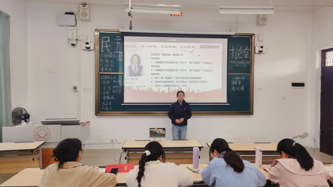 11月28日,地理科学与规划学院本科生地科第二党支部在南宁师范大学武鸣校区1号教学楼412教室召开民主讨论会,会议由支部组织委员黄小同志主持,支部全体党员参会。