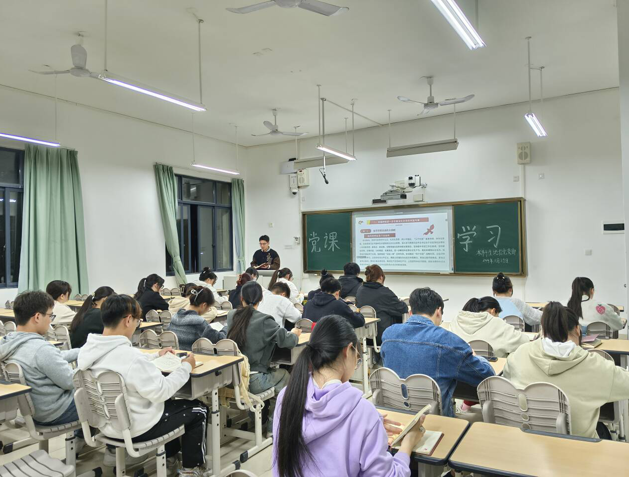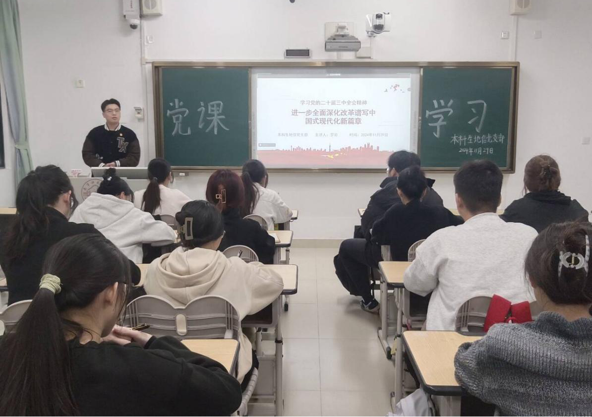 2024年11月29日,地理科学与规划学院本科生地信党支部于武鸣校区一号教学楼301教室召开了以“学习党的二十届三中全会精神,进一步全面深化改革谱写中国式现代化新篇章”为主题的党课。会议由罗岩同志主持,支部全体党员参会。