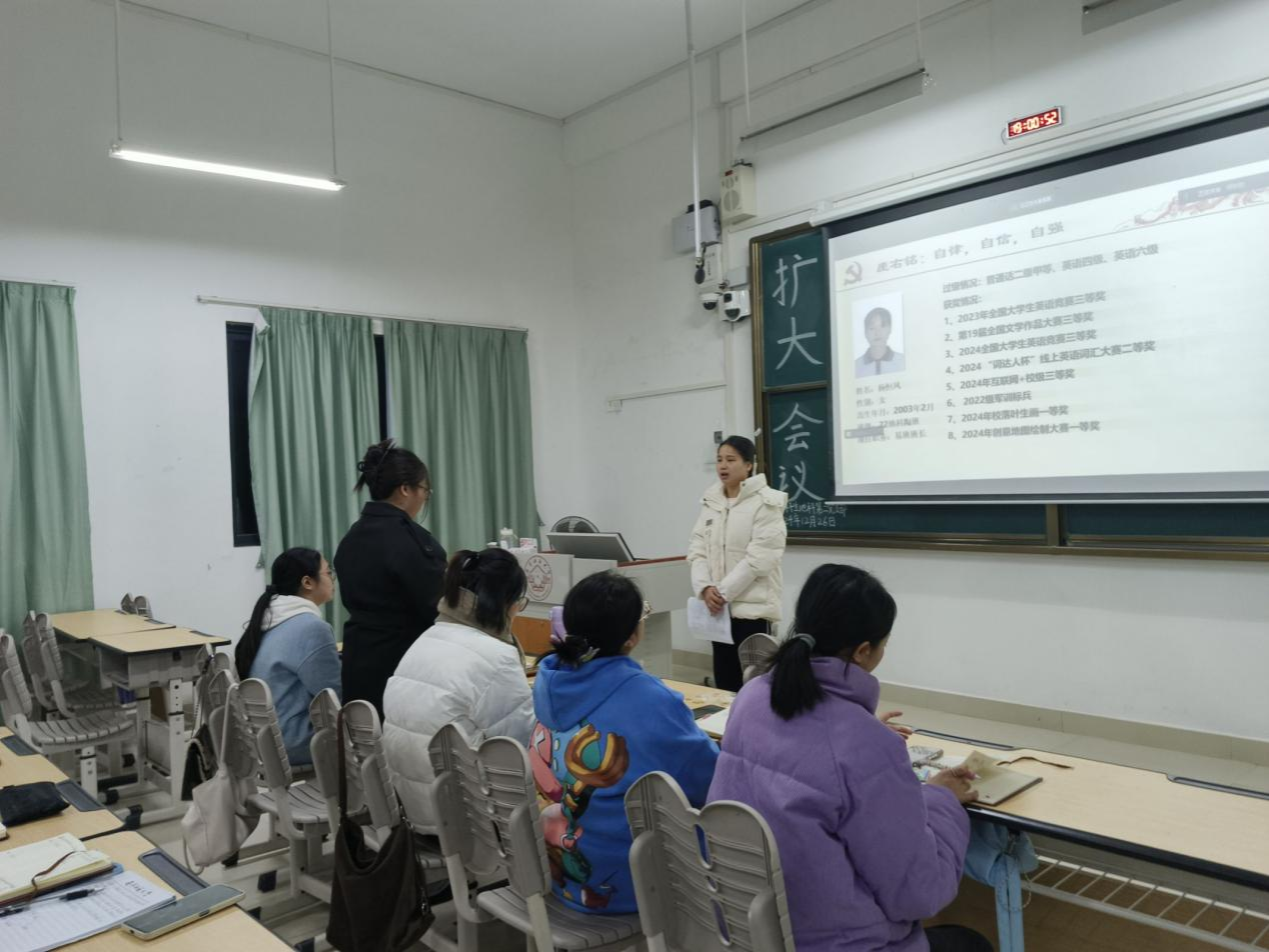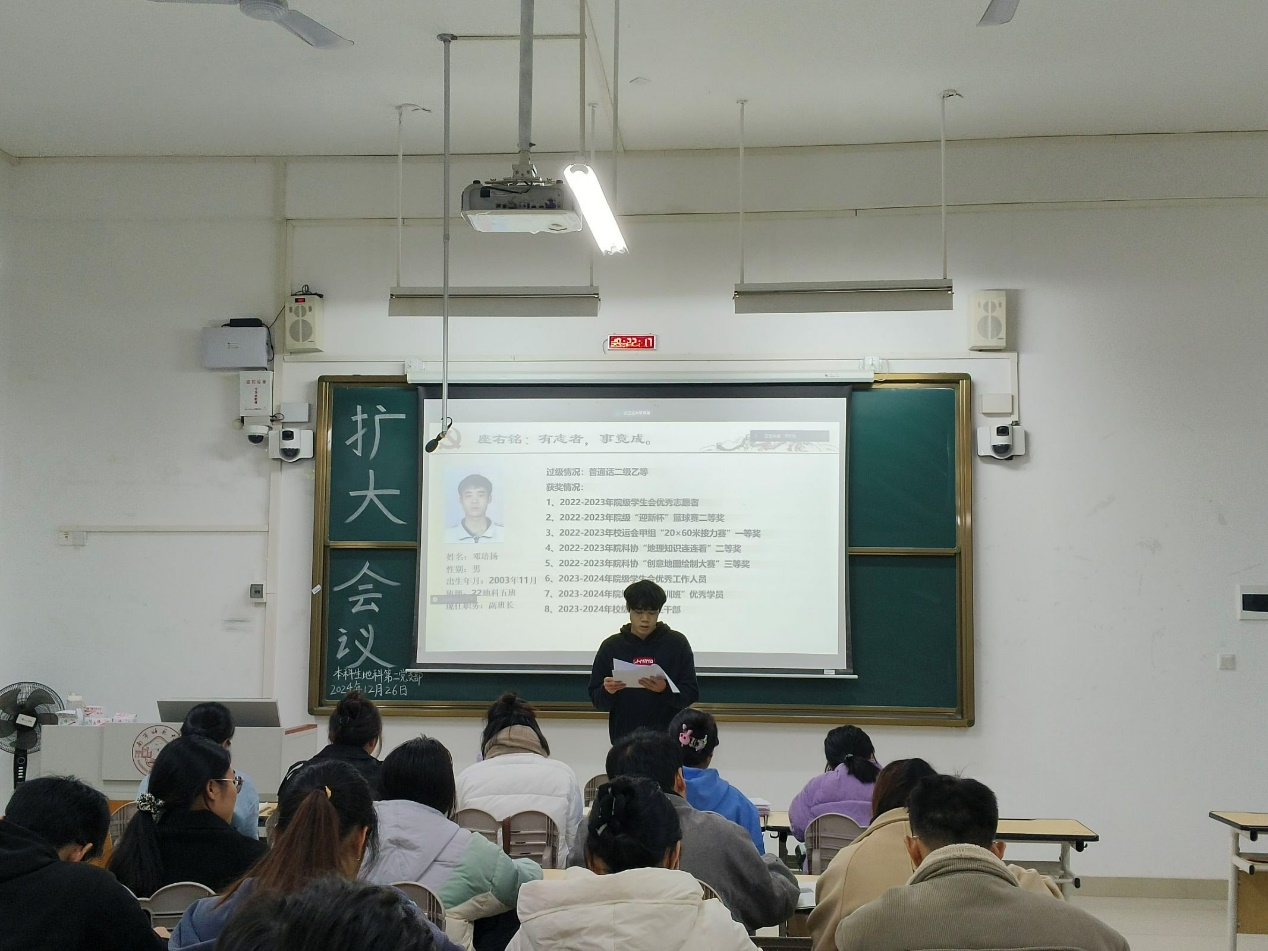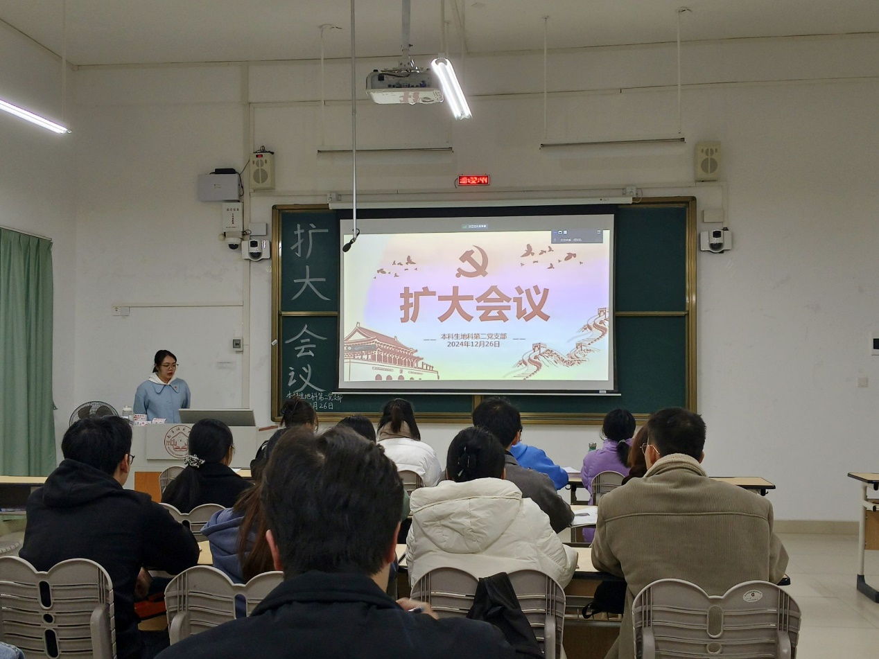 2024年12月26日,地理科学与规划学院本科生地科第二党支部在武鸣校区1号教学楼120教室召开2024下半年扩大会议。本次会议由支部组织委员黄小同志主持,支部全体成员参会。