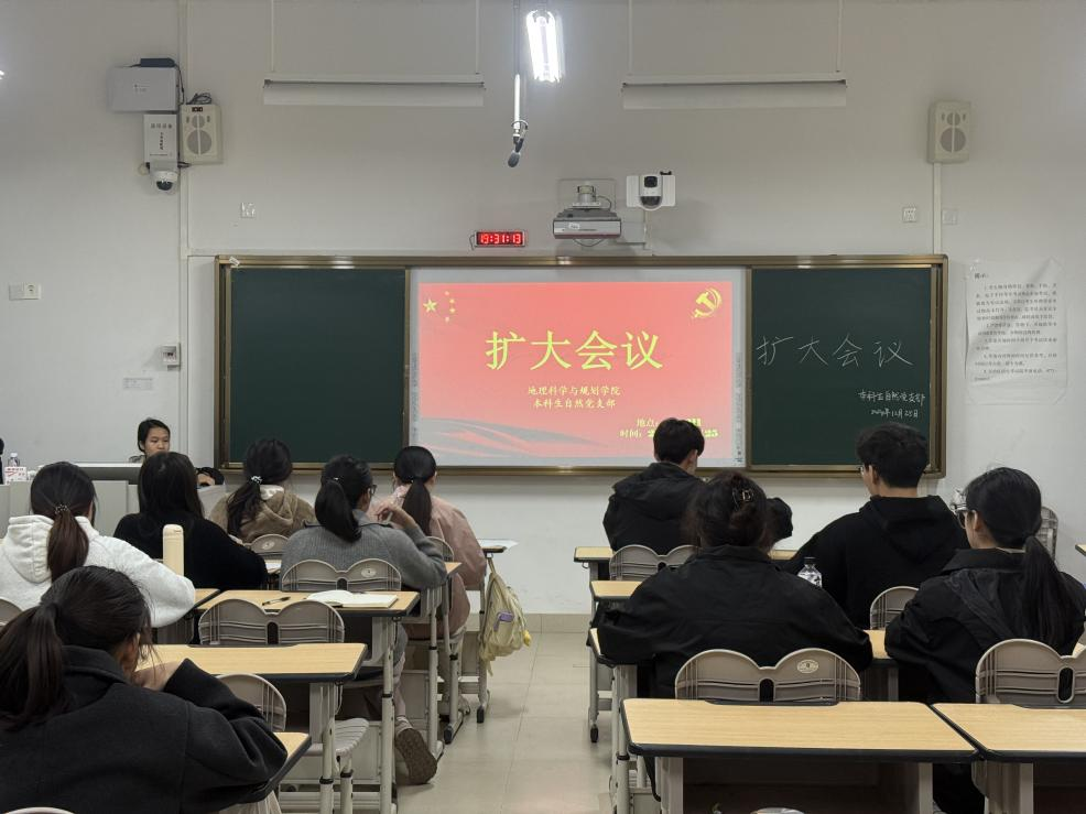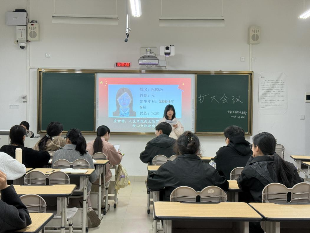 2024年12月25日,地理科学与规划学院本科生自然党支部在武鸣校区1号教学楼211教室召开扩大会议。本次会议由党支部书记黄珊珊主持,全体党支部成员共同参与。