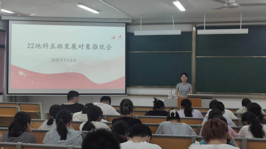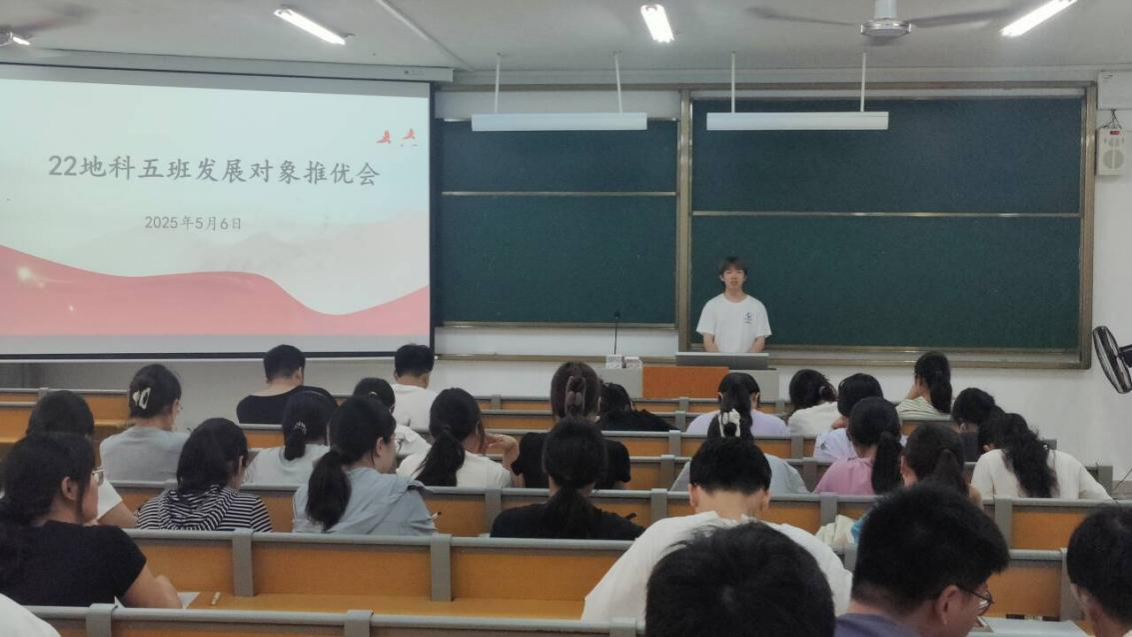 5月6日,地理科学与规划学院22级地科5班和地科专升本班在武鸣校区二号实验楼A304教室召开发展对象推优会。会议由团支书李朔燕主持,驻党李霞、杨通立列席参与。