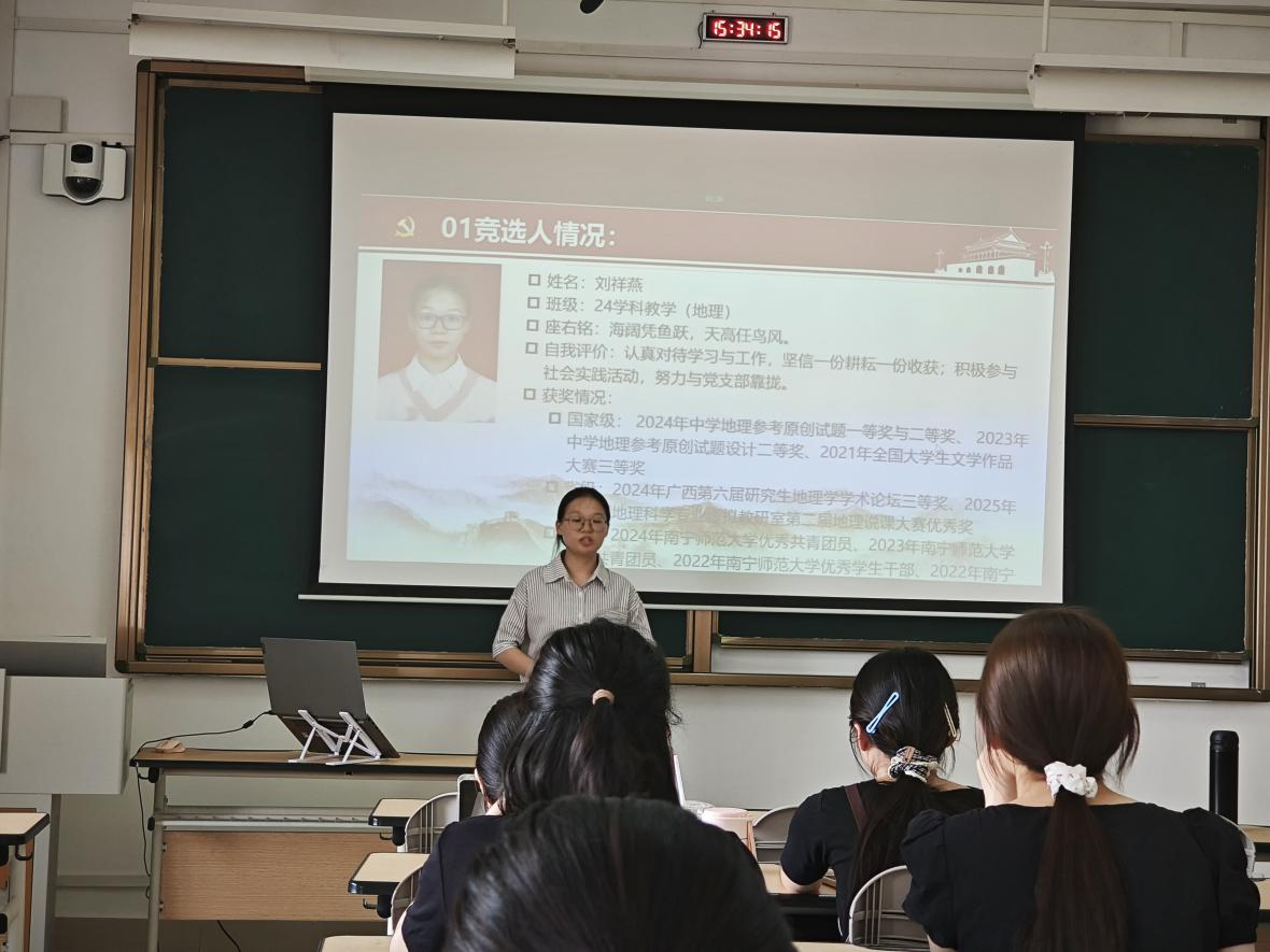 4月20日,地理科学与规划学院学科教学(地理)专业硕士研究生党支部在武鸣校区2号教学楼315教室召开支部民主讨论会。会议由组织委员姜婕同志主持,支部全体党员和积极分子参加。