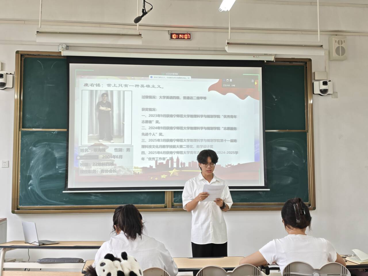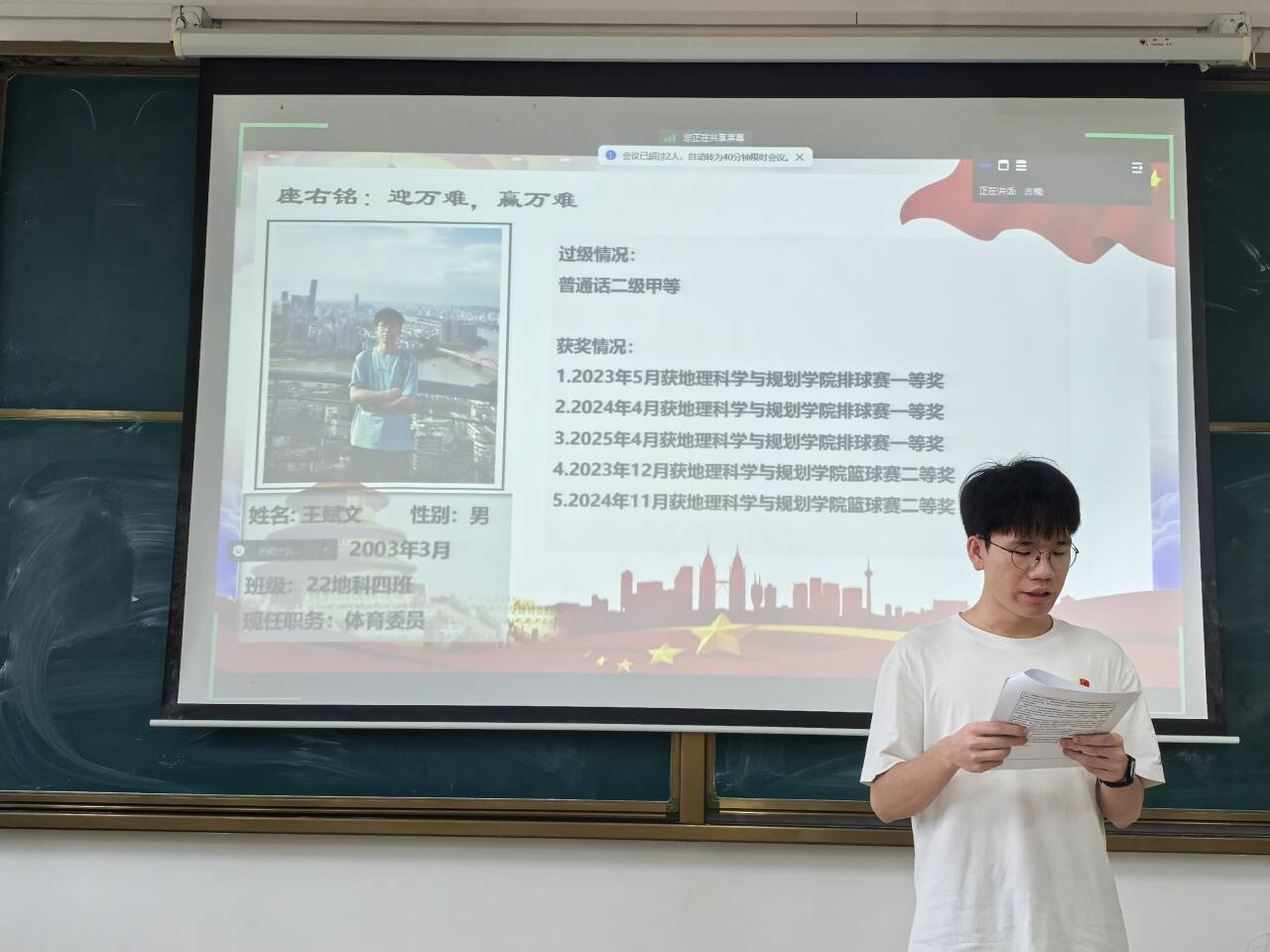 6月16日,地理科学与规划学院本科生地科第一党支部在武鸣校区2号教学楼216教室召开了2025年上半年扩大会议。会议由支部组织委员胡佳琦主持,支部全体党员及15名发展对象共同参与。