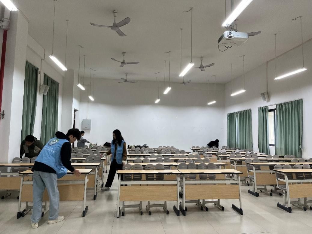 (同志们认真摆放教室桌椅)